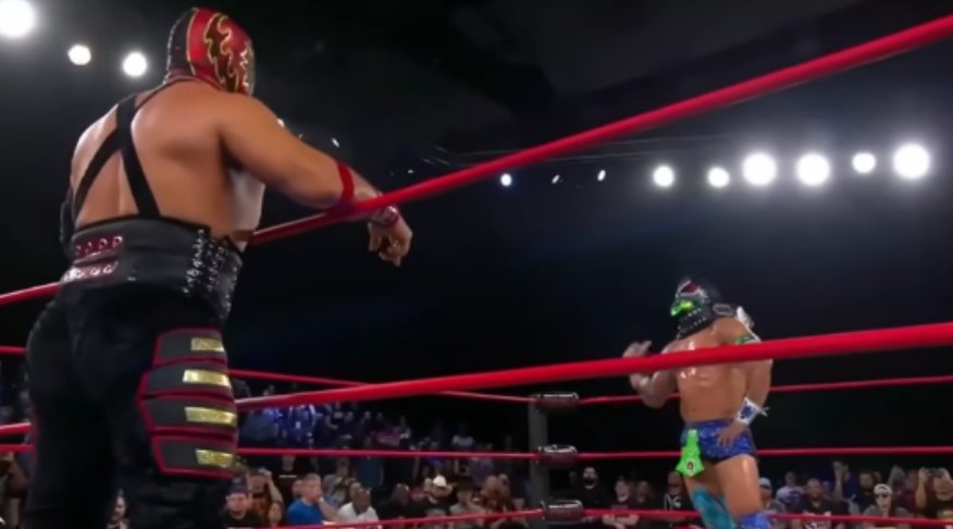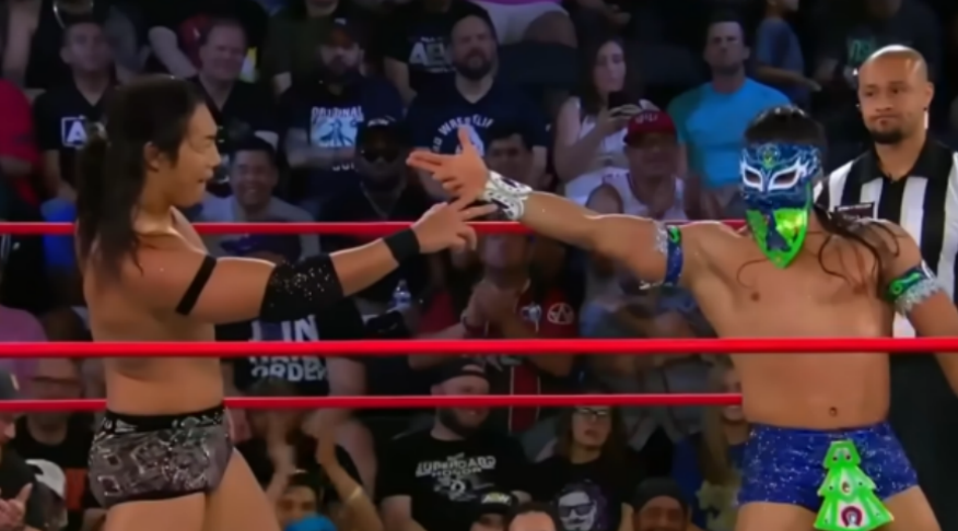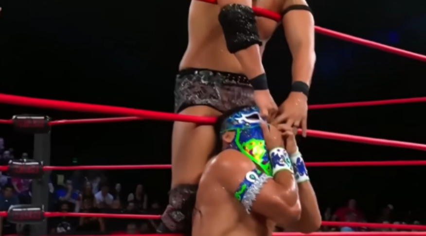 Bandido had him in prime position for the 21-Plex. Takeshita sunk his hips to stop the momentum and even used it to launch Bandido onto the apron. It’s now time for the disrespect as Takeshita starts ripping at the mask. Don Callis got off the commentary desk and skipped his way to the ring like he’s a giddy child. Rocky Romero appeared from the Starship Enterprise and handed Takeshita a steel chair. Takeshita went to crush Bandido’s head with a chair, but luckily Bandido moved. Bandido went to go for the Tope Suicida, but Takeshita took the chair and held it up as Bandido’s head went crashing into it. That ended up busting him open as Takeshita dragged Bandido up the ramp. Bandido got dropped on his head with the Vertical Drop Brainbuster by Takeshita. Despite having low energy, Bandido got back in the ring at the count of 19. Takeshita did the American version of antagonism. He really is an International wrestler. He continued this by biting the exposed part of Bandido’s face from the mask in the corner. He starts to SLOW IT DOWN with a chin lock on the champion. Apparently, it was bad as Referee Brandon Martinez had to lift up his arm to ensure he wasn’t knocked out. This is funny because of the camera angle of which we see the look on Bandido’s face. Bandido is starting to get fired up as he managed to get Takeshita up for a big suplex.