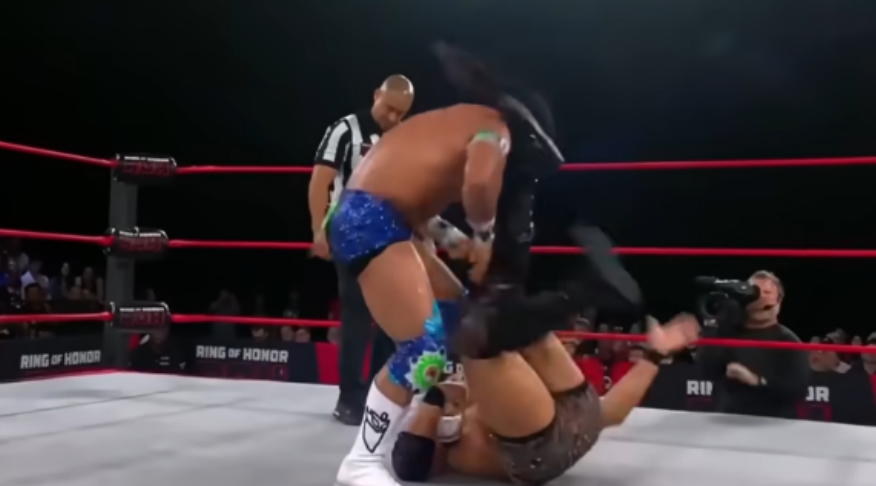 Takeshita connects with the Straight Murder (Charged Elbow Splash) and goes for the Raging Fire (Spinning Falcon Arrow). Bandido counters that into the Most Devastating Move in All Of Sports Entertainment, the Surprise Rollup to get 1, 2, 3. That means Bandido has retained the Ring Of Honor World Championship.